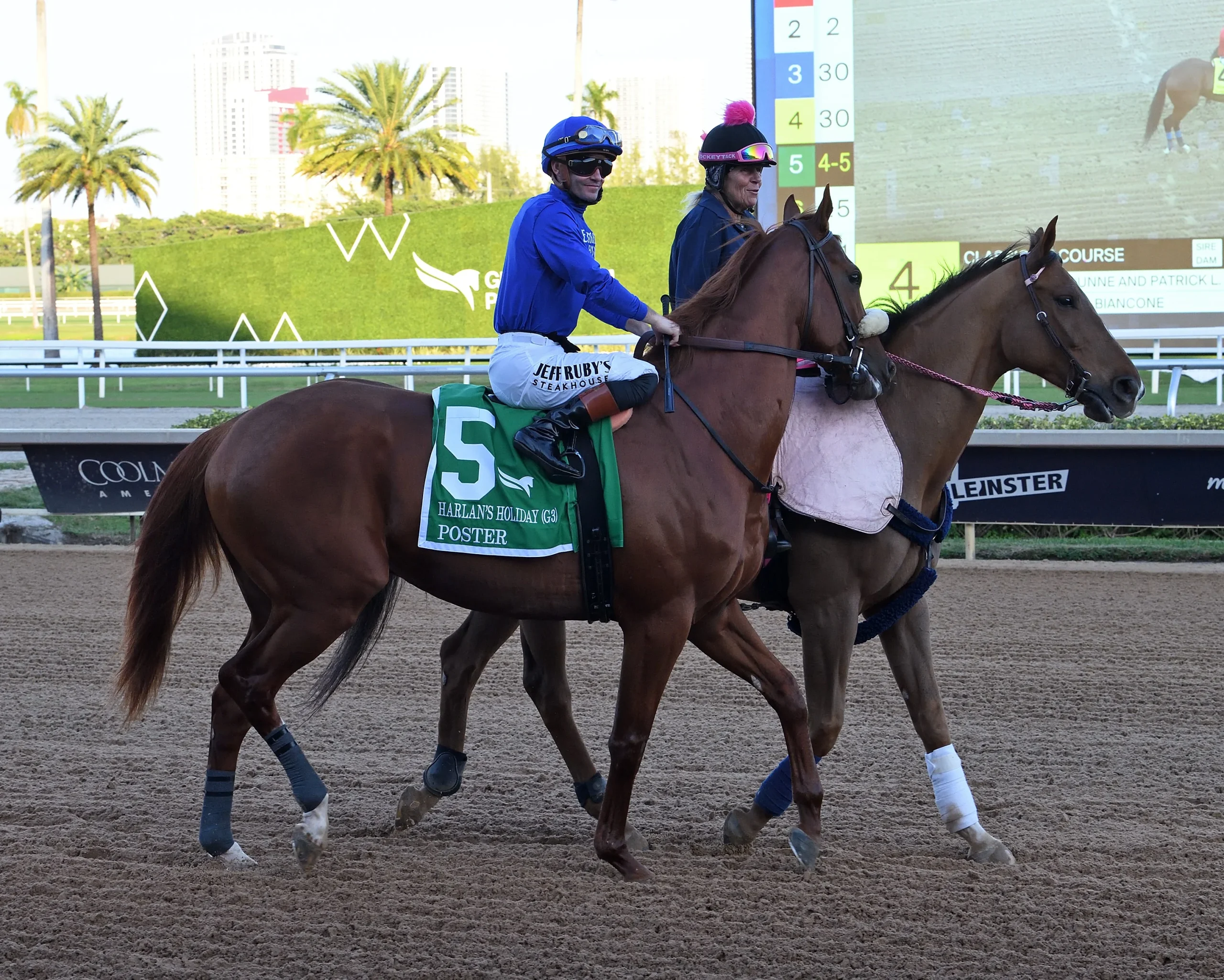 Poster, with Junior Alvarado up for trainer Eoin Harty, will be equipped with blinkers to keep him focused on the task. He was beaten a head by Skippylongstocking in the Harlan’s Holiday Stakes (G3) at Gulfstream on Dec. 20 and has won four of seven starts for Eclipse Award-winning owner Godolphin.