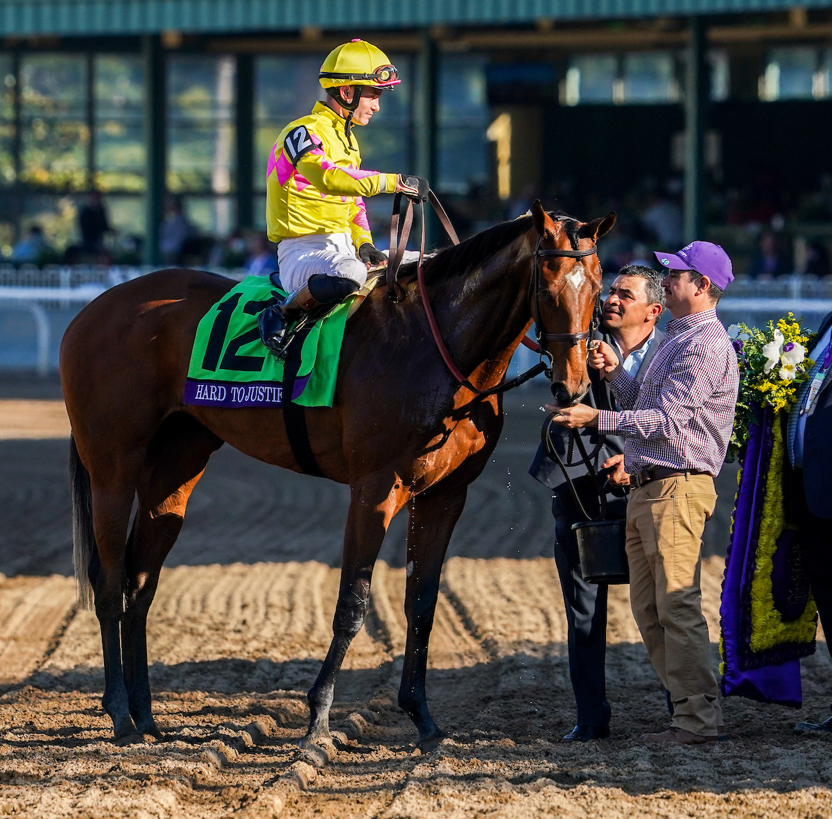 November 3, 2023: Hard to Justify, ridden by Flavien Prat, wins the Breeders’ Cup Juvenile Fillies Turf on Breeders’ Cup Championship Friday at Santa Anita Park in Arcadia, California on November 3, 2023. Shamela Hanley/Eclipse Sportswire/Breeders Cup