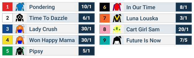 P# 1 | Horse: Pondering (KY) | Age/Sex: 3/F | Jockey: T Gaffalione | Wgt: 118 | Trainer: B P Walsh | M/L: 10/1