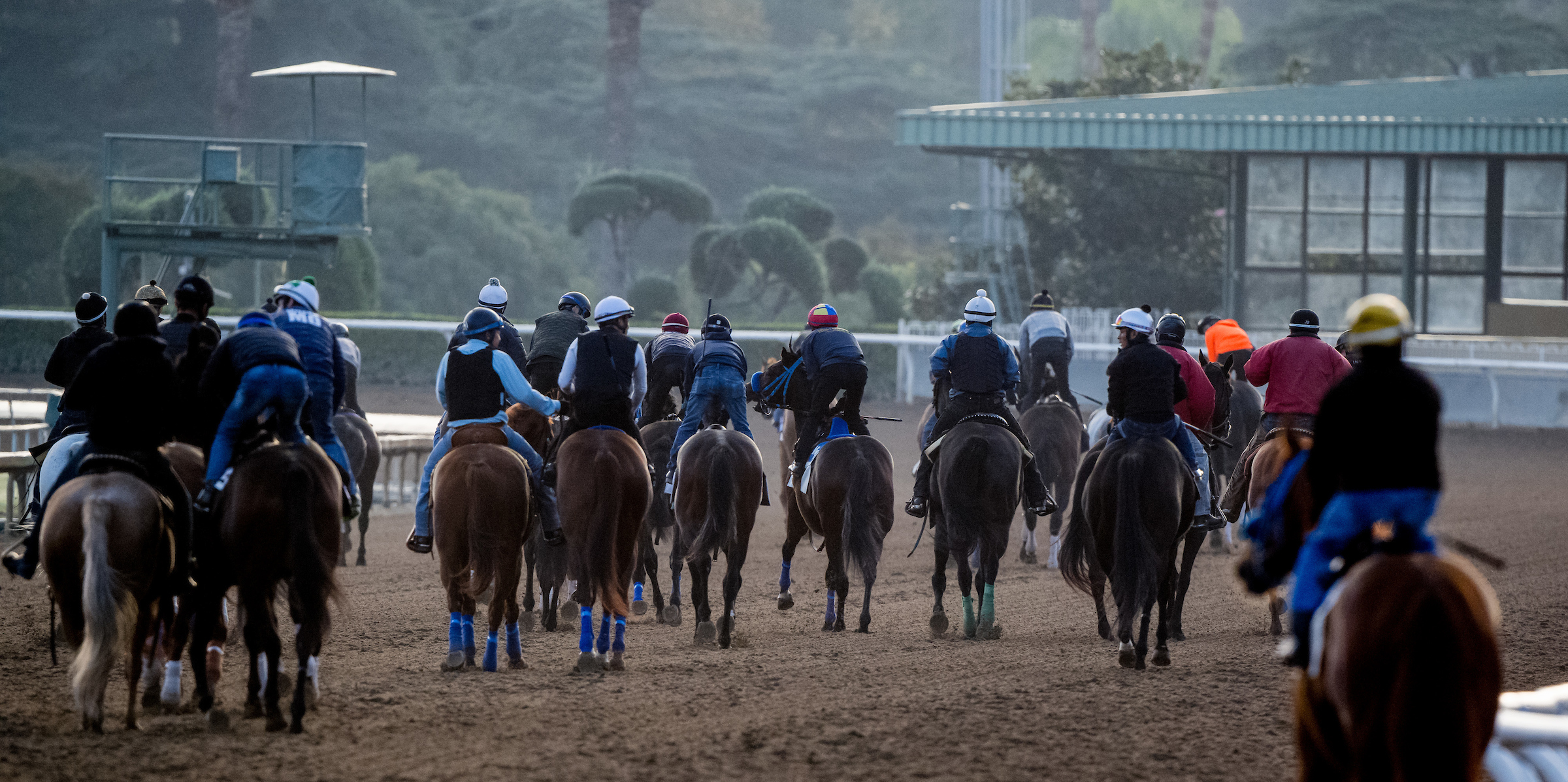 Horses head on to the track during morning workouts at Santa Anita Park in Arcadia, California on October 28, 2023 as horses prepare for the 2023 Breeders’ Cup World Championships. Scott Serio/Eclipse Sportswire/Breeders Cup
