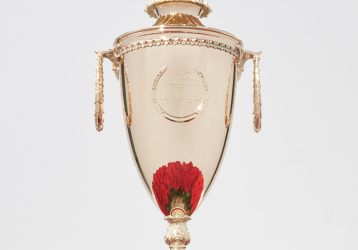 The Kentucky Derby trophy, first presented in its modern iteration in 1924, is believed to be the sole solid gold trophy awarded for a major American sporting event. Hand-hammered from a brick of 14-karat gold, with 20-karat gold adornments, it takes more 2,000 man-hours to produce and months to com...